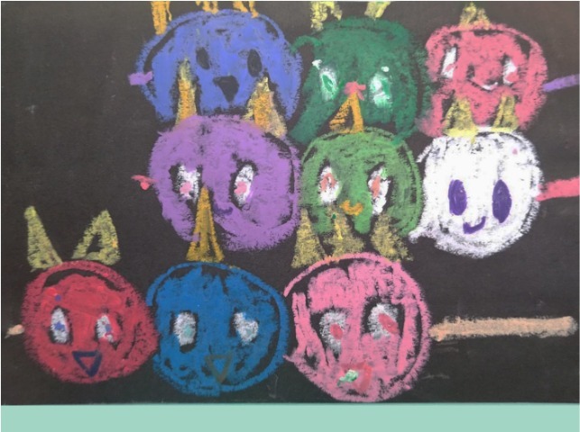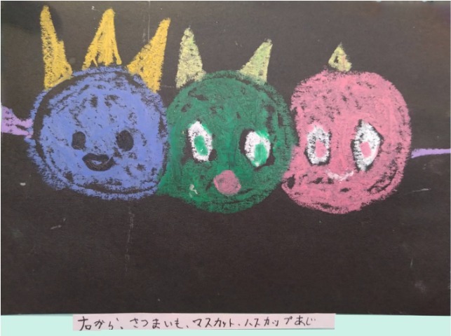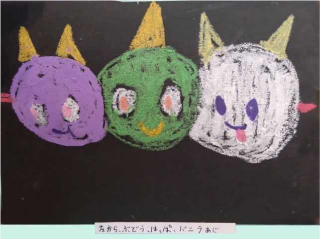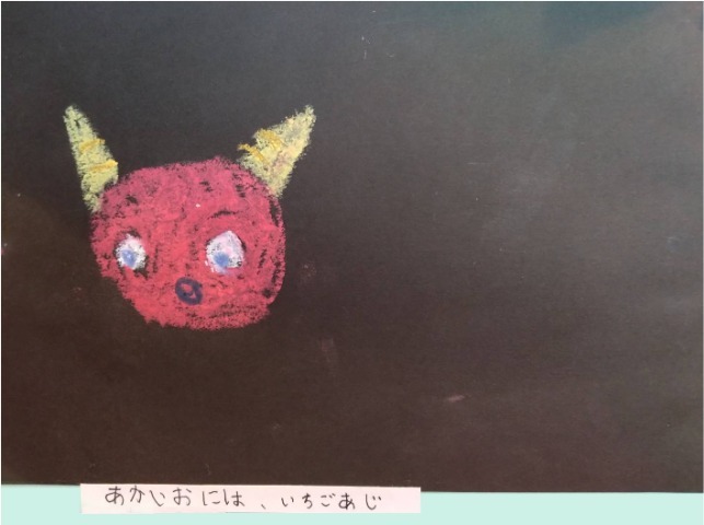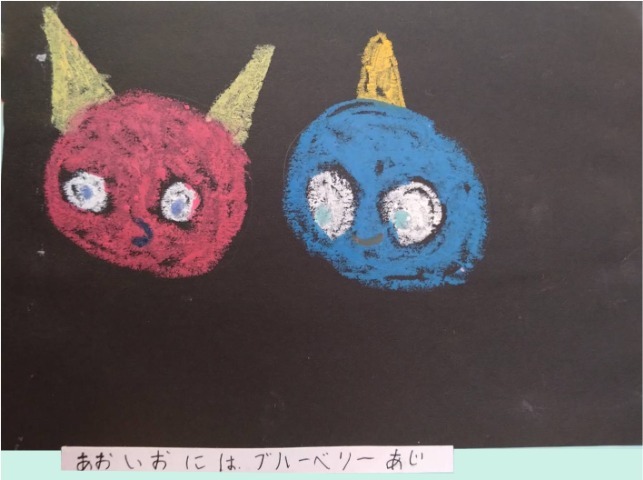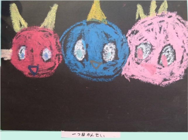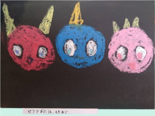 パステルで丸を描いたら、鬼に見えてきました。丸い鬼を並べて描いたら、団子のようになったので、串を描いて、鬼の団子にしました。頑張ったことは、最後のページに全員のせたところです。