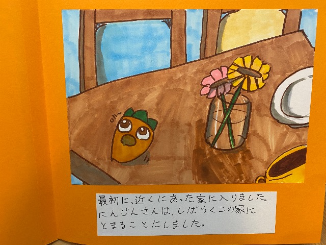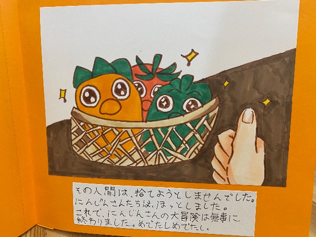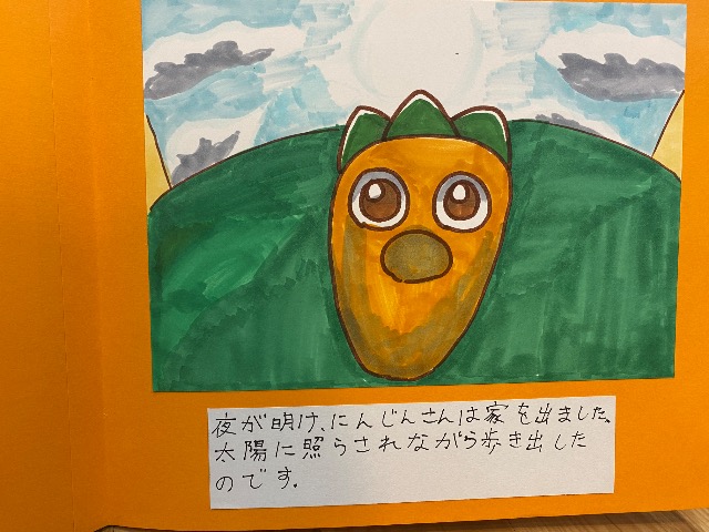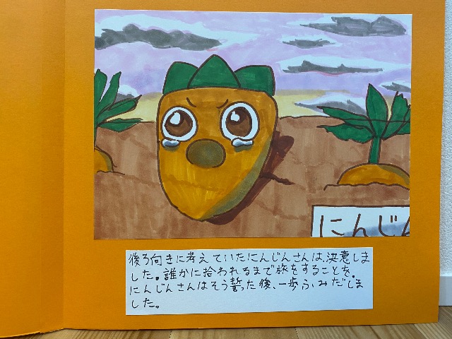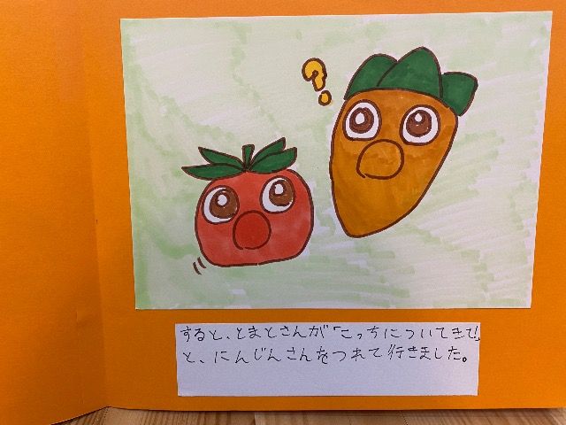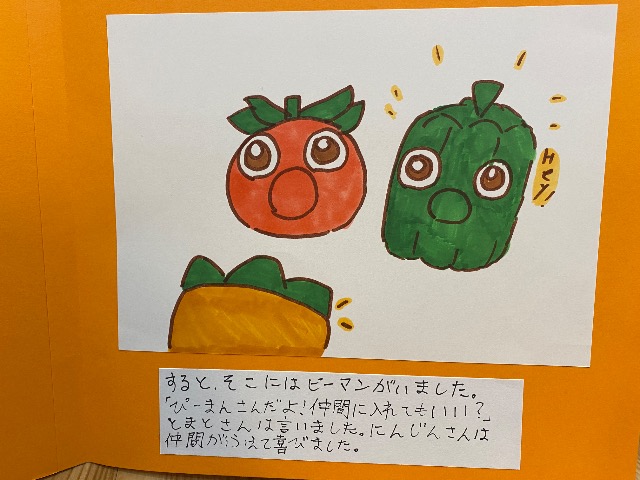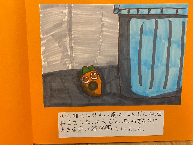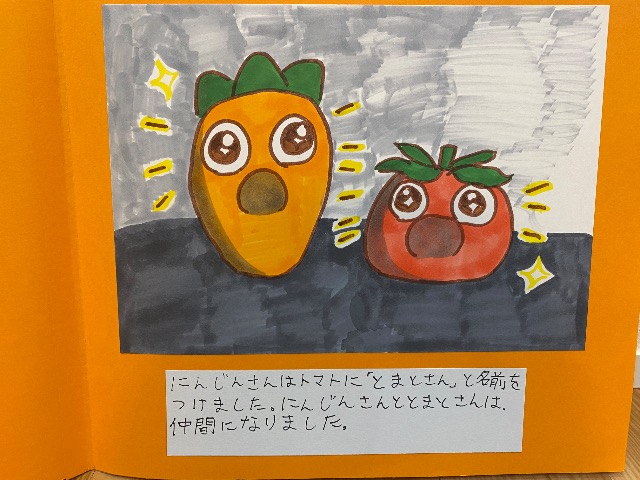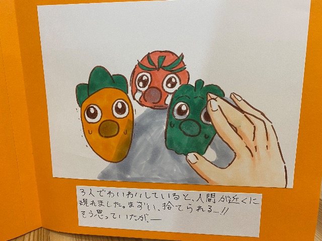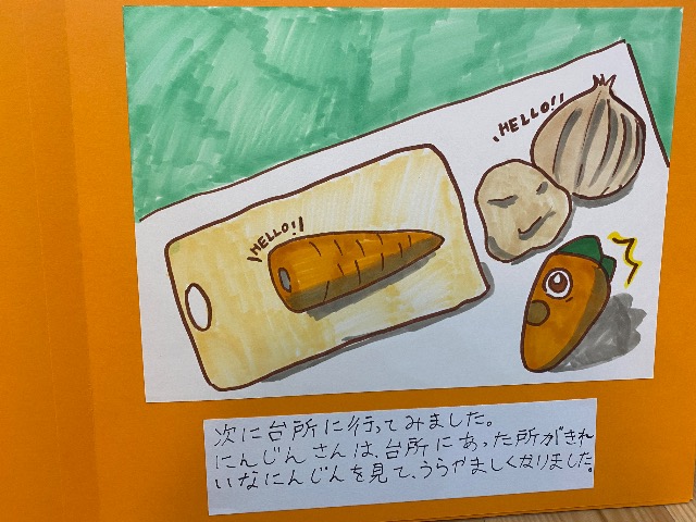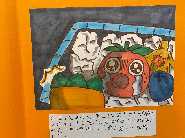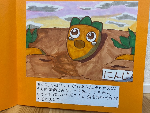 捨てられてしまう野菜達を 生き生きとした表情にさせて 食べ物や物を大事にしたいという思いがあったようです。 色塗りも影をつけながら丁寧に仕上げました。