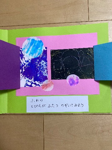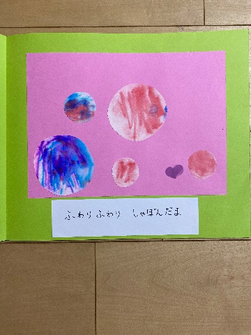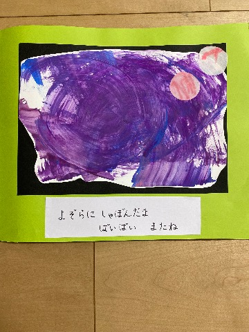だいじに だいじに つくりました。 しゃぼんだまは ふわりふわり とんでいって、 どこに いくのかなって かんがえました。 とびらを のぞくと、 おててに しゃぼんだまが のって、 よるの そらにも とんでいきます。 きえると さみしいけど、 「ばいばい またね」って いうと、 また あえる きが します。 この えほんを よんだ ひとも、 しゃぼんだまの たびを いっしょに たのしんで ほしいです。