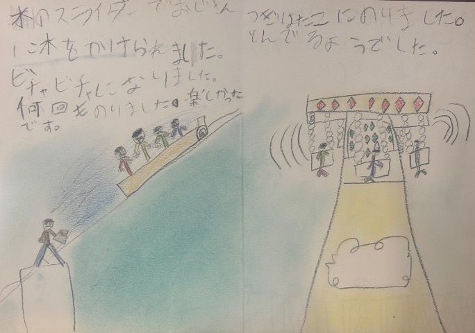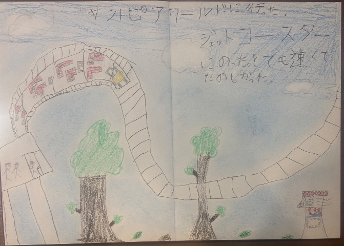 夏休みにお友達と行った遊園地の思い出を絵本にしました。ジェットコースターや化石はっくつ、お友達と一緒だとどれも楽しかったよ。