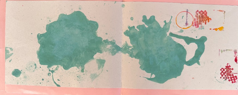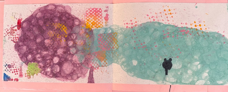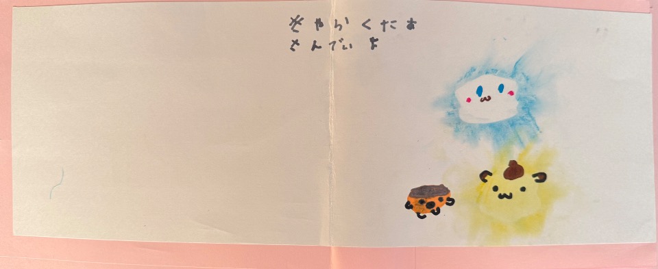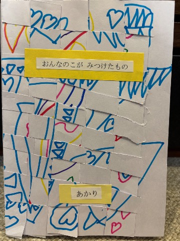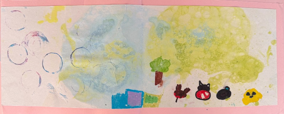 最初に出てくる4人のキャラクターがいろんなものに変身していくお話です。 シャボン玉やいろんな道具を使って色を塗りました。