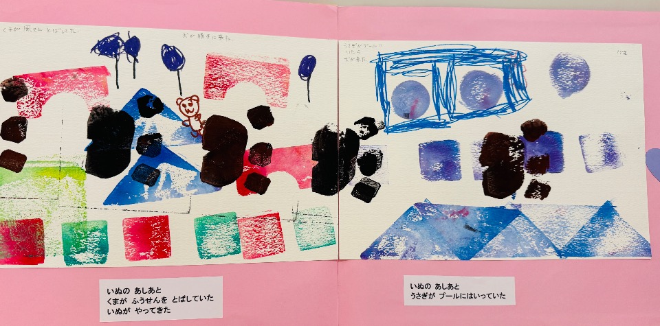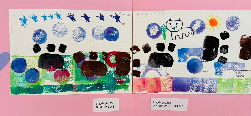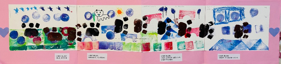 大好きないぬがいろんな動物に会いに行ったよ! いろんな形のスタンプを作って長い絵本を作り上げました。