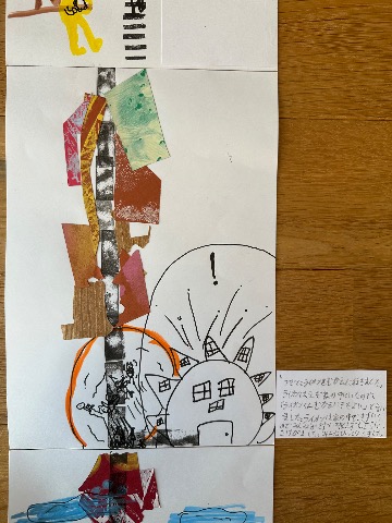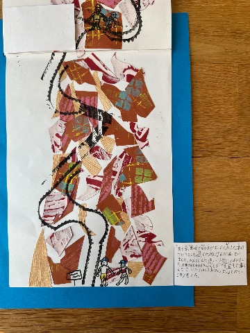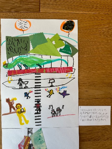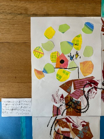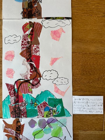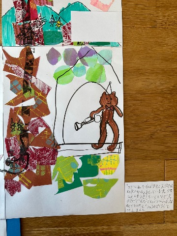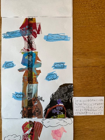 この絵本は縦に、下から上へと話が展開していきます。 木をいろんな紙で作ったところがお気に入りです。