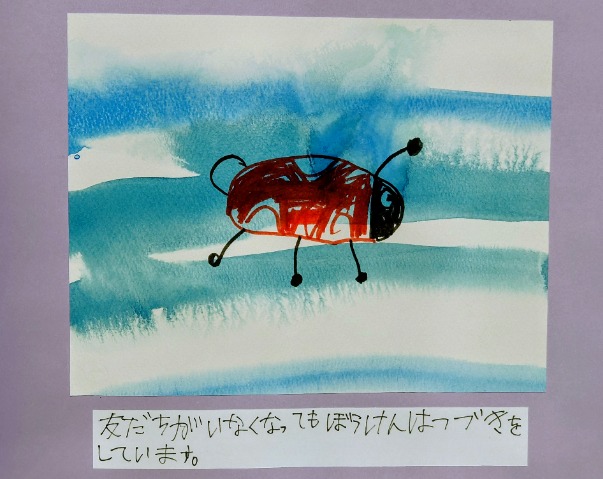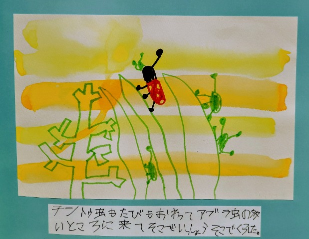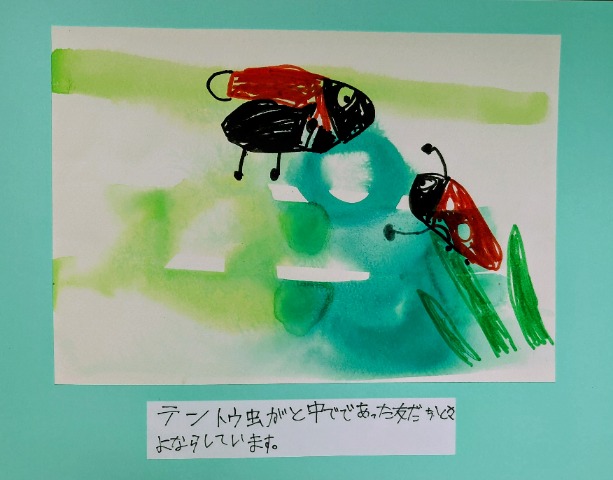 教室の窓のテントウ虫の絵を見て、テントウ虫のお話を作ろうと思って作成しました。