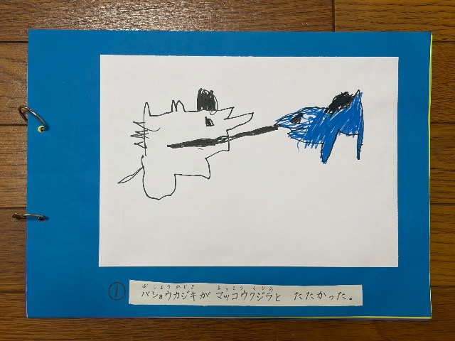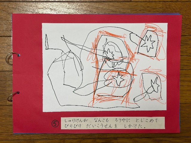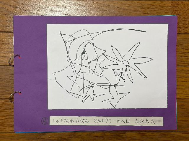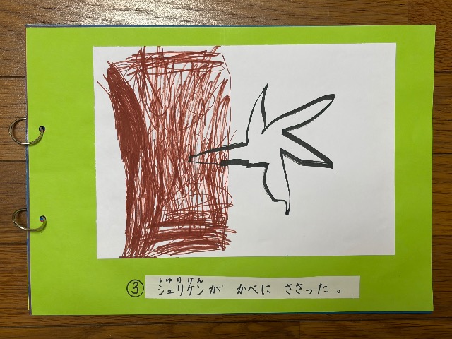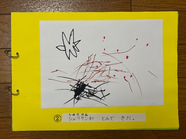 最後のページが難しかったです。 手裏剣を何個も描いて、びりびり光線を描くところを頑張りました。
