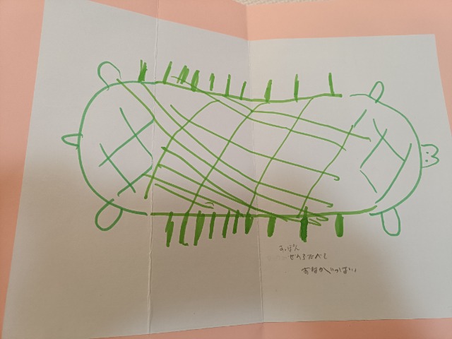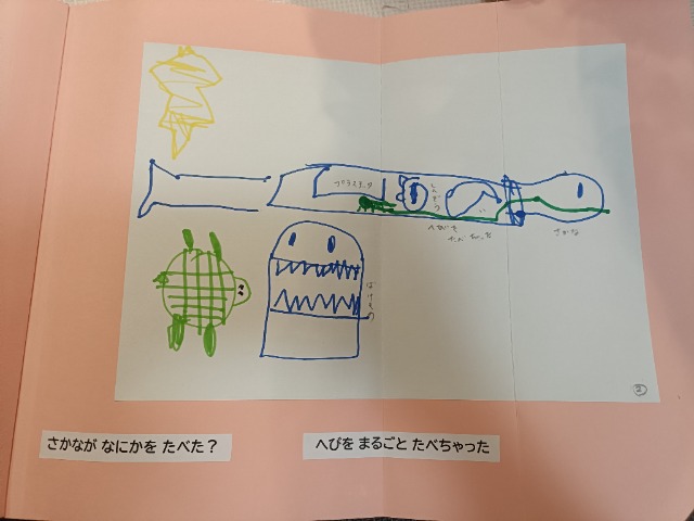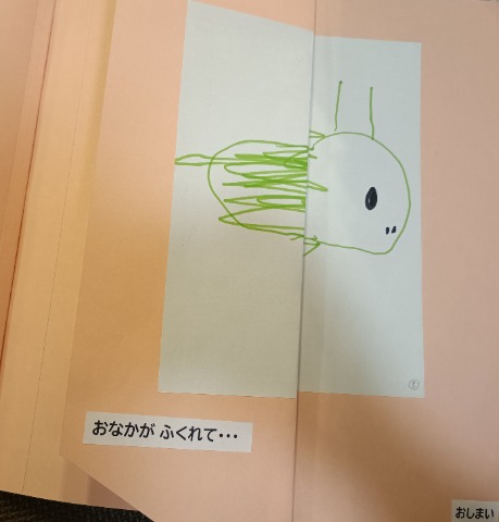 生き物が好きな娘がご飯を食べておなかいっぱいになる様子を表現しました。